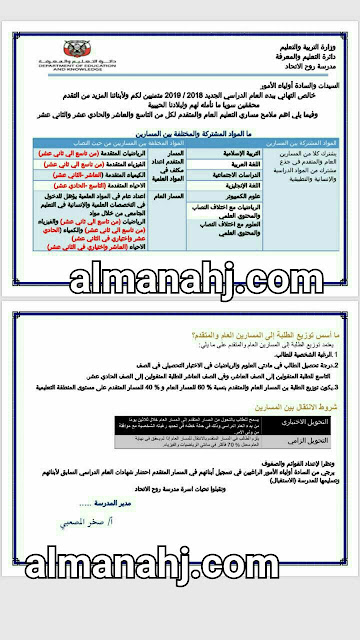 تفاصيل الخبر: الفرق بين المسارين العام والمتقدم مع توضيح اسس توزيع الطلبة بينهما وكذلك شروط الانتقال للعام الدراسي 2018-2019 | ||