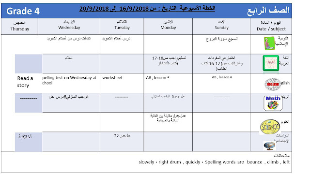 | الخطة الأسبوعية للصف الرابع من 16 وحتى 20 الشهر التاسع 2018 | ||