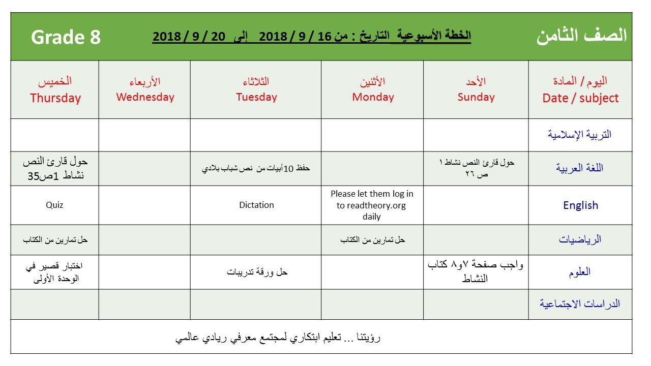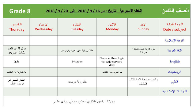 | الخطة الأسبوعية للصف الثامن من 16 وحتى 20 الشهر التاسع 2018 | ||