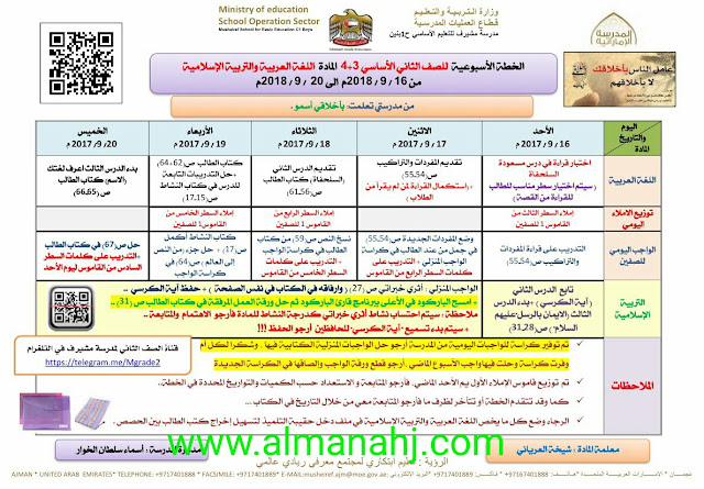 | الخطة الاسبوعية لمادتي للصف الثاني 3+4لمادتي اللغة العربية والتربية الاسلامية من 1620 الشهر | ||