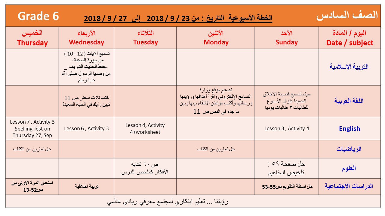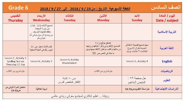 تفاصيل الخبر: الصف السادس, الفصل الأول, 2018-2019, الخطة الاسبوعية من 23-27 ايلول | ||