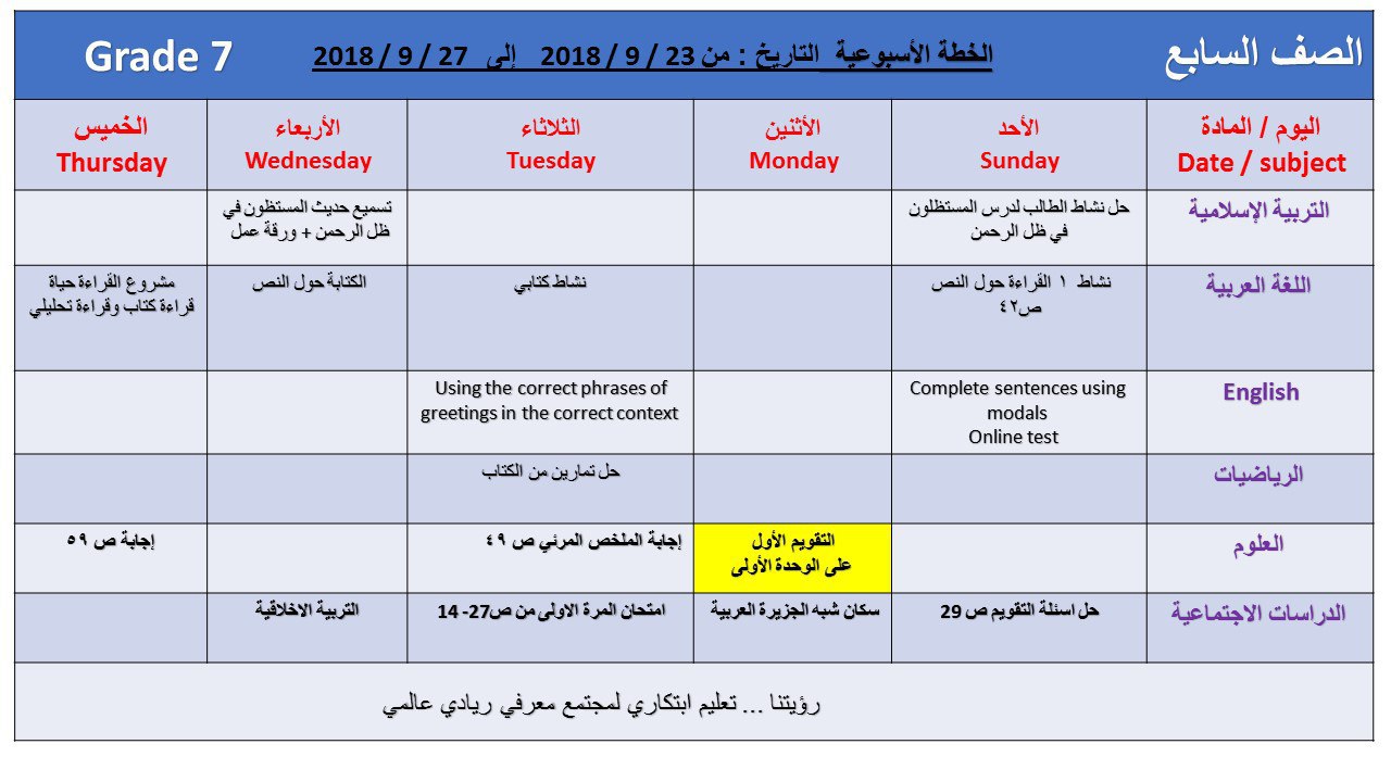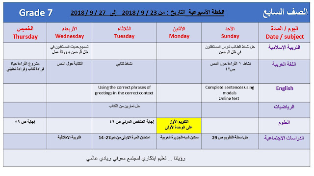 تفاصيل الخبر: الصف السابع, الفصل الأول, 2018-2019, الخطة الاسبوعية 23-27 ايلول | ||