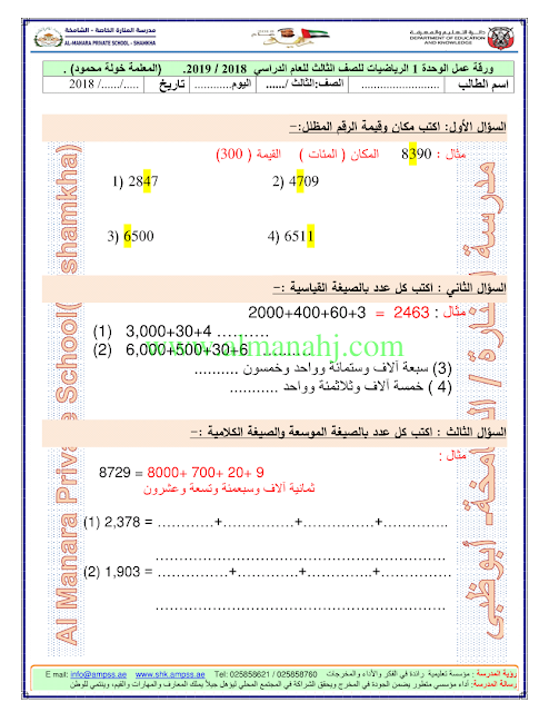 معلومات الملف: الصف الثالث, الفصل الأول, رياضيات, 2018-2019, اوراق عمل حول ترتيب الاعداد ومكان وقيمة العدد/ مراجعة شاملة للوحدة الاولى/ | |||