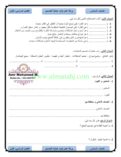 معلومات الملف: الصف السادس, الفصل الثالث, تصميم, 2017-2018, ورقة عمل عملية التصميم | |||