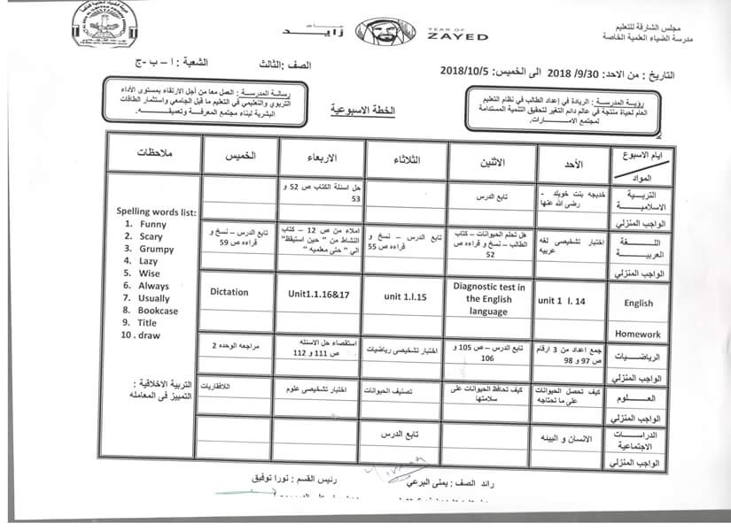 تفاصيل الخبر: الخطةالاسبوعية للصف الثالث من 30 /9 حتى 4 /10 مدرسة الضياء العلمية الخاصة | ||