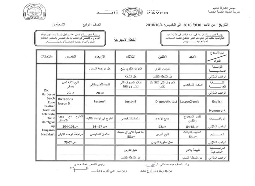 تفاصيل الخبر: الخطةالاسبوعية للصف الرابع من 30 /9 حتى 4 /10 مدرسة الضياء العلمية الخاصة | ||