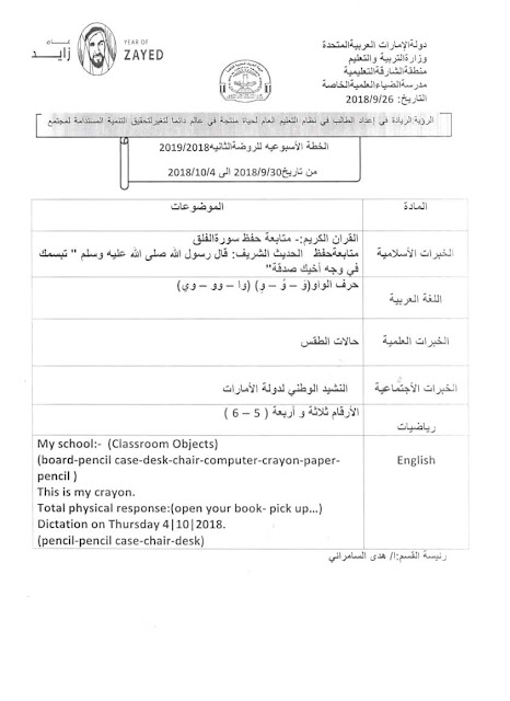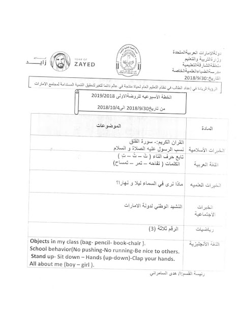 تفاصيل الخبر: الخطةالاسبوعية للروضة الأولى والروضى الثانية من 30 /9 حتى 4 /10 مدرسة الضياء العلمية الخاصة | ||