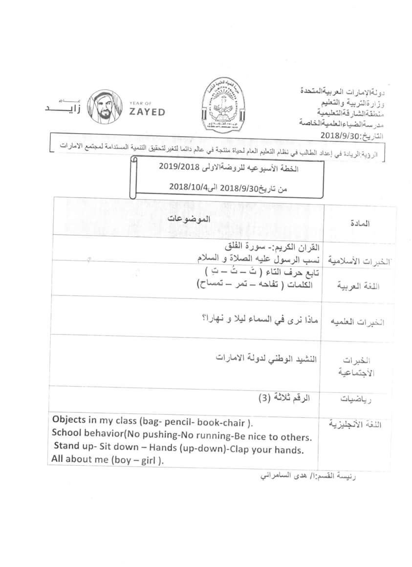 الخطةالاسبوعية للروضة الأولى والروضى الثانية من 30 /9 حتى 4 /10 مدرسة الضياء العلمية الخاصة | ||