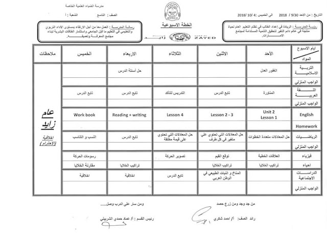 | الخطةالاسبوعية للصف التاسع من 30 /9 حتى 4 /10 مدرسة الضياء العلمية الخاصة | ||