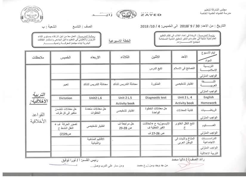 الخطةالاسبوعية للصف التاسع من 30 /9 حتى 4 /10 مدرسة الضياء العلمية الخاصة | ||