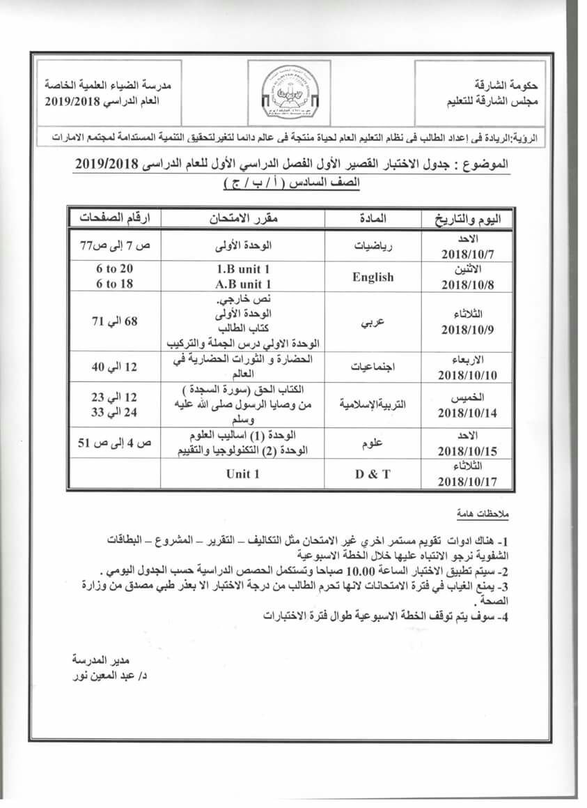تفاصيل الخبر: الصف السادس, الفصل الأول, 2018-2019, جدول الاختبار القصير الاول مع المقررات في مدرسة الضياء الخاصة | ||