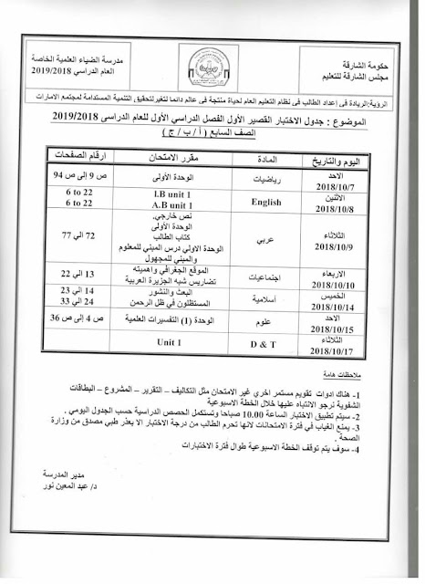 تفاصيل الخبر: الصف السابع, الفصل الأول, 2018-2019,جدول الاختبار القصير الاول مع المقررات في مدرسة الضياء الخاصة | ||