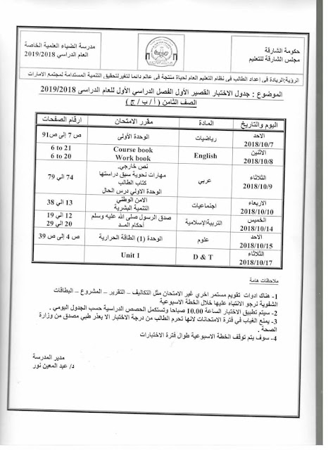 تفاصيل الخبر: الصف الثامن, الفصل الأول, 2018-2019,جدول الاختبار القصير الاول مع المقررات في مدرسة الضياء الخاصة | ||