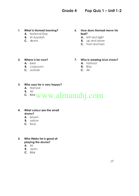 معلومات الملف: الصف الرابع, الفصل الأول, لغة انكليزية, 2018-2019, Pop Quiz 1 – Unit 1-2 | |||