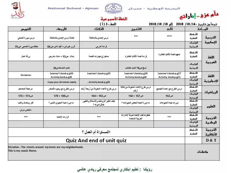 | الخطة الاسبوعية للصفوف اول ـ ثاني ـ ثالث من 14 الى 18/10/2018 المدرسة الوطنية ـ عجمان | ||