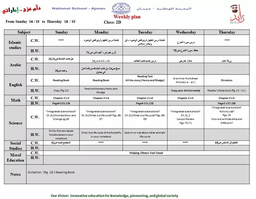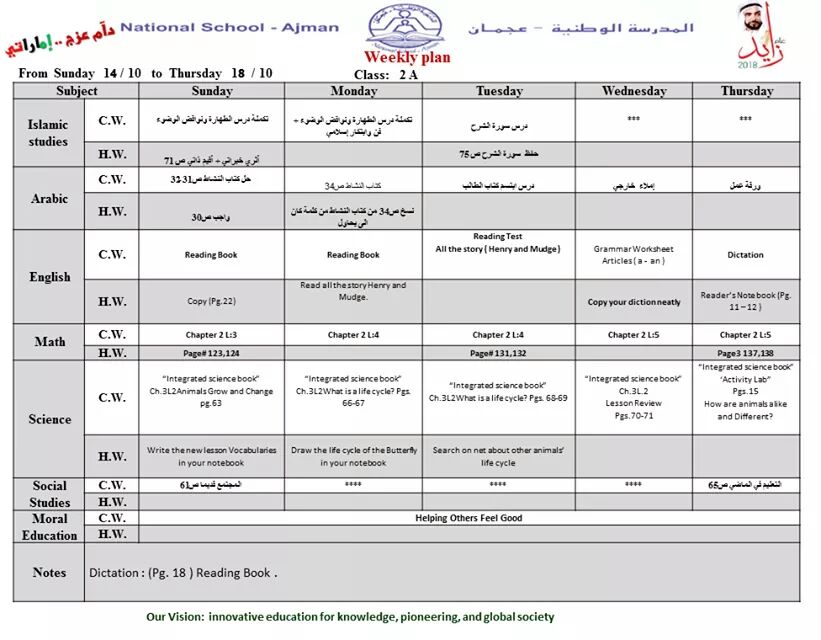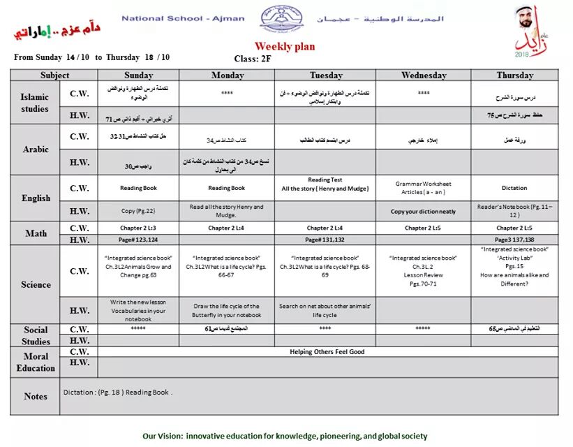 تفاصيل الخبر: الخطة الاسبوعية للصفوف اول ـ ثاني ـ ثالث من 14 الى 18/10/2018 المدرسة الوطنية ـ عجمان | ||