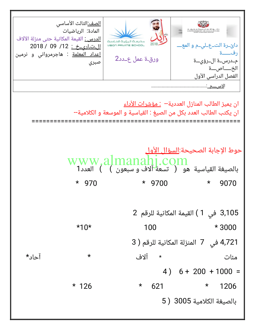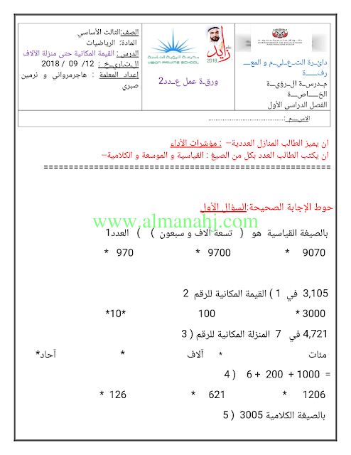 معلومات الملف: الصف الثالث, الفصل الأول, رياضيات, 2018-2019, القيمة المكانية حتى منزلة الالاف | |||