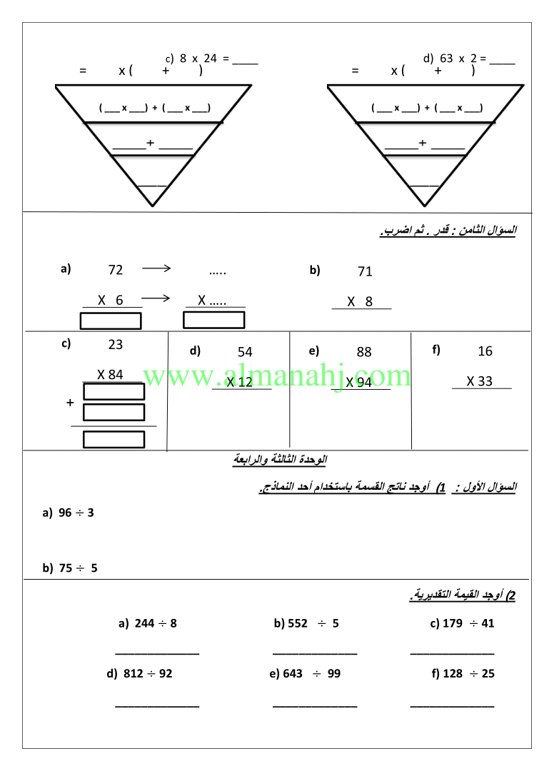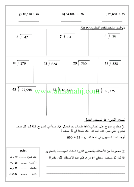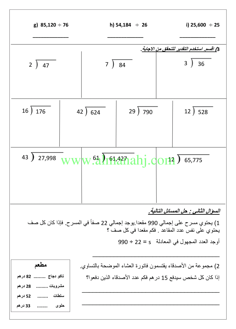 معلومات الملف: يحتوي هذا الملف على مراجعة امتحان نهاية الفصل الأول لمادة الرياضيات: الوحدة الأولى السؤال الأول: كيفية قراءة عدد وإكمال مخطط القيمة المكانية وكتابة العدد فيه،كتابة عدد بالصيغة الكلامية والصيغة الموسعة. السؤال الثاني: كتابة قيمة الرقم الذي تحته خط، كتابة أعداد بالصيغة الموسعة، كتابة أعداد بالصيغة القياسية، وضع اسم لمنزلة الرقم المظلل. السؤال الثالث: تظليلنموذجلتمثيل كل كسر وكتابة كل كسر بصورة كسر عشري ونسبة مئوية، تظليلنموذجلتمثيل كل كسر وكتابة كل كسر بصيغة كلامية وبصورة كسر عشري. السؤال الرابع: كتابة أكبر أو أصغر أو يساوي لتكوين جملة صحيحة، ترتيب الأعداد من الأكبر إلى الأصغر، كتابة كسور عشرية بالصورة القياسية. السؤال الخامس: حل مسائل. الوحدة الثانية السؤال الأول: إيجاد تحليل كل عدد إلى عوامل أولية باستخدام الأسس. السؤال الثاني: كتابة القوة الأسية في صورة ناتج ضرب العامل نفسه ثم إيجاد القيمة. السؤال الثالث: كتابة ناتج عبارة باستخدام الأس. السؤال الرابع: إيجاد ناتج ضرب. السؤال الخامس: إيجاد العدد الناقص. السؤال السادس: إيجاد حل كل مسألة بإنشاء جدول. السؤال السابع: إكمال جدول حسب نمط، الضرب باستخدام النموذج، إيجاد ناتج الضرب باستخدام خاصية التوزيع. السؤال الثامن: قدر ثم اضرب. الوحدة الثالثة والرابعة السؤال الأول: إيجاد ناتج القسمة باستخدام أحد النماذج، إيجاد القيمة التقديرية، التقسيم باستخدام التقدير للتحقق من الإجابة. السؤال الثاني: حل مسائل. السؤال الثالث: كتابة مجموعة حقائق، إكمال فراغ. السؤال الرابع: القسمة باستخدام خاصية التوزيع لإنشاء رسم بياني بالأعمدة. | ||