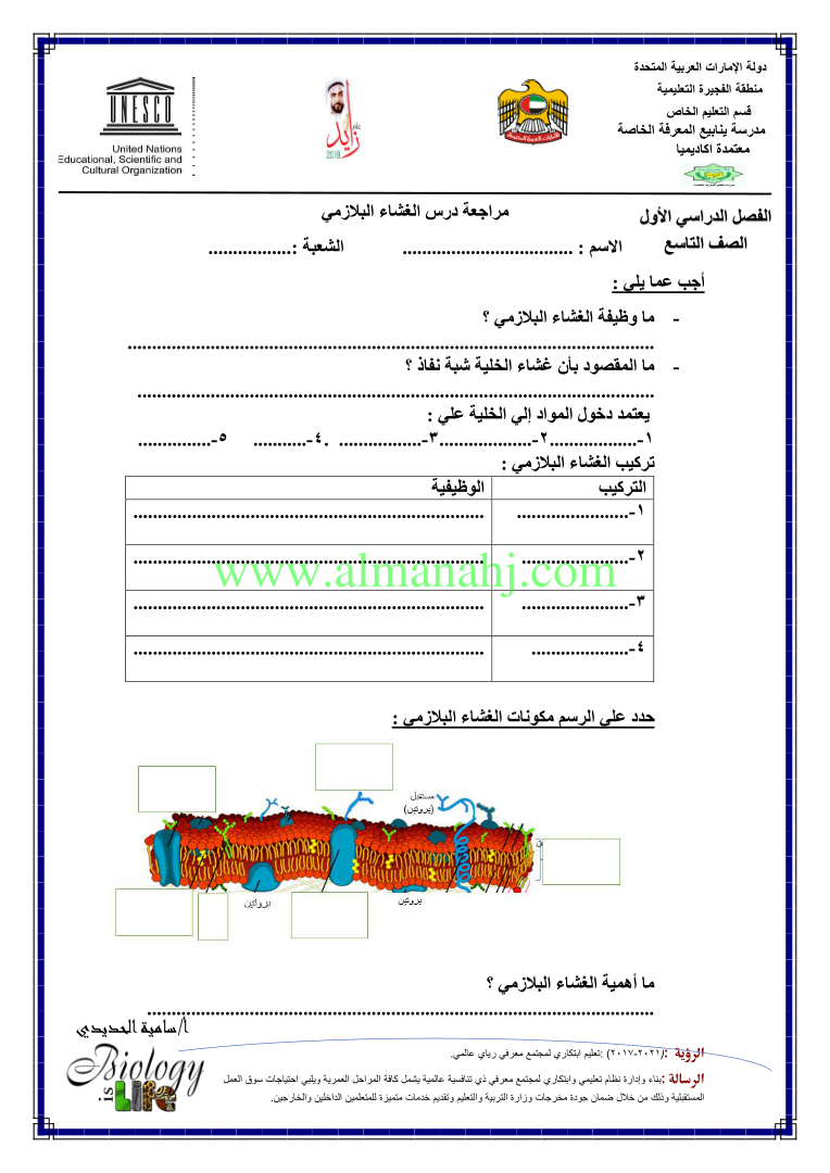 معلومات الملف: الصف التاسع, الفصل الأول, علوم, 2018-2019, مراجعة الغشاء البلازمي | |||