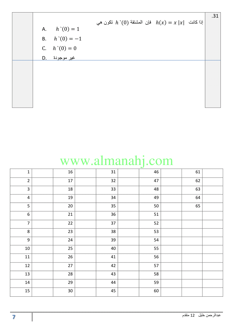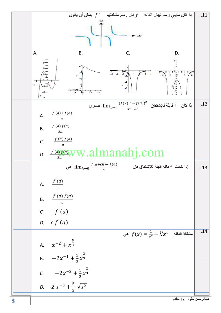 | السابق: قواعد المشتقات | الملف الحالي: 5859 | التالي: مراجعة الدرس السابع Derivatives of Exponential and Logarithmic Functions مشتقة الدوال الأسية والدوال اللوغاريتمية من الوحدة الثالثة (اختبر نفسك 11) | |