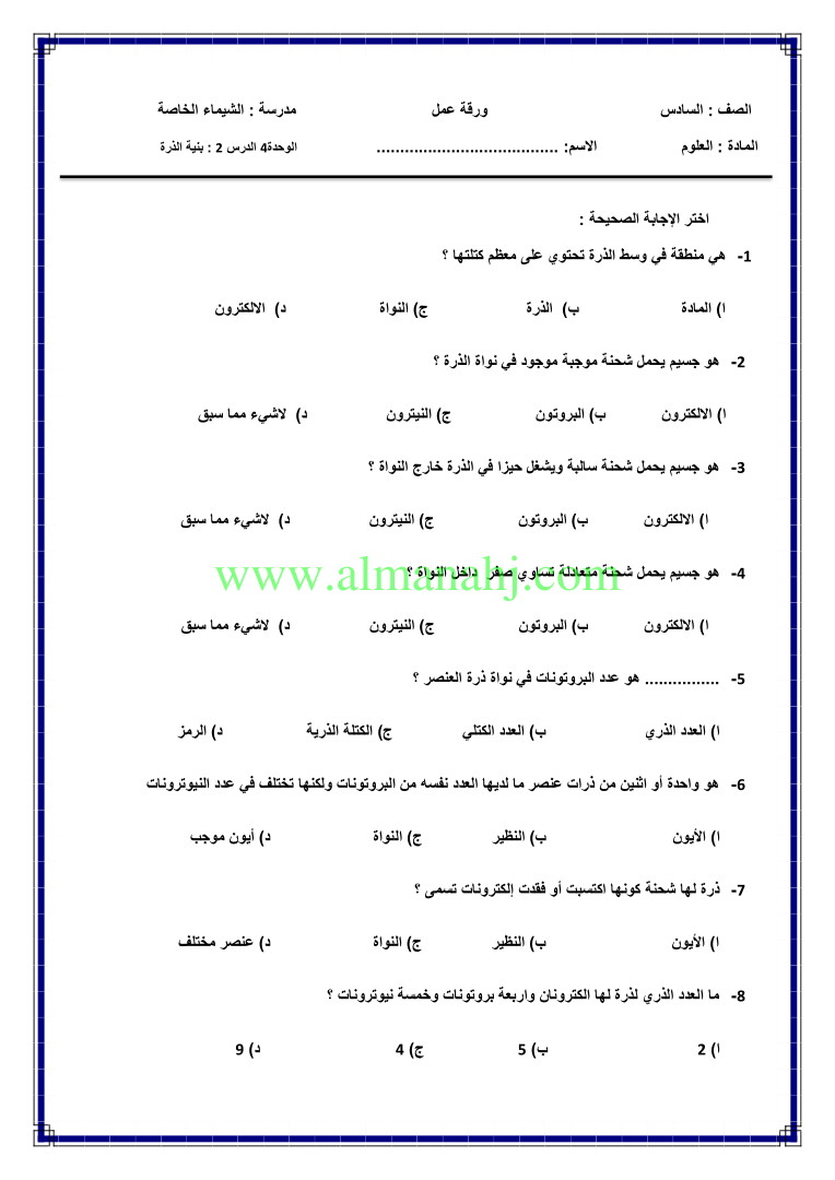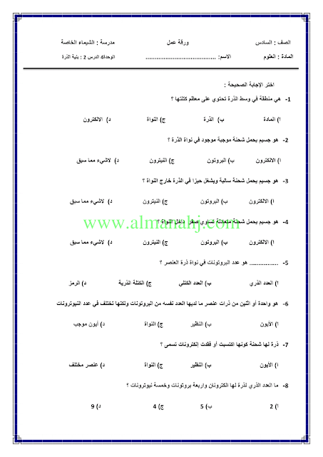 معلومات الملف: الصف السادس, الفصل الأول, علوم, 2018-2019, بنية الذرة | |||