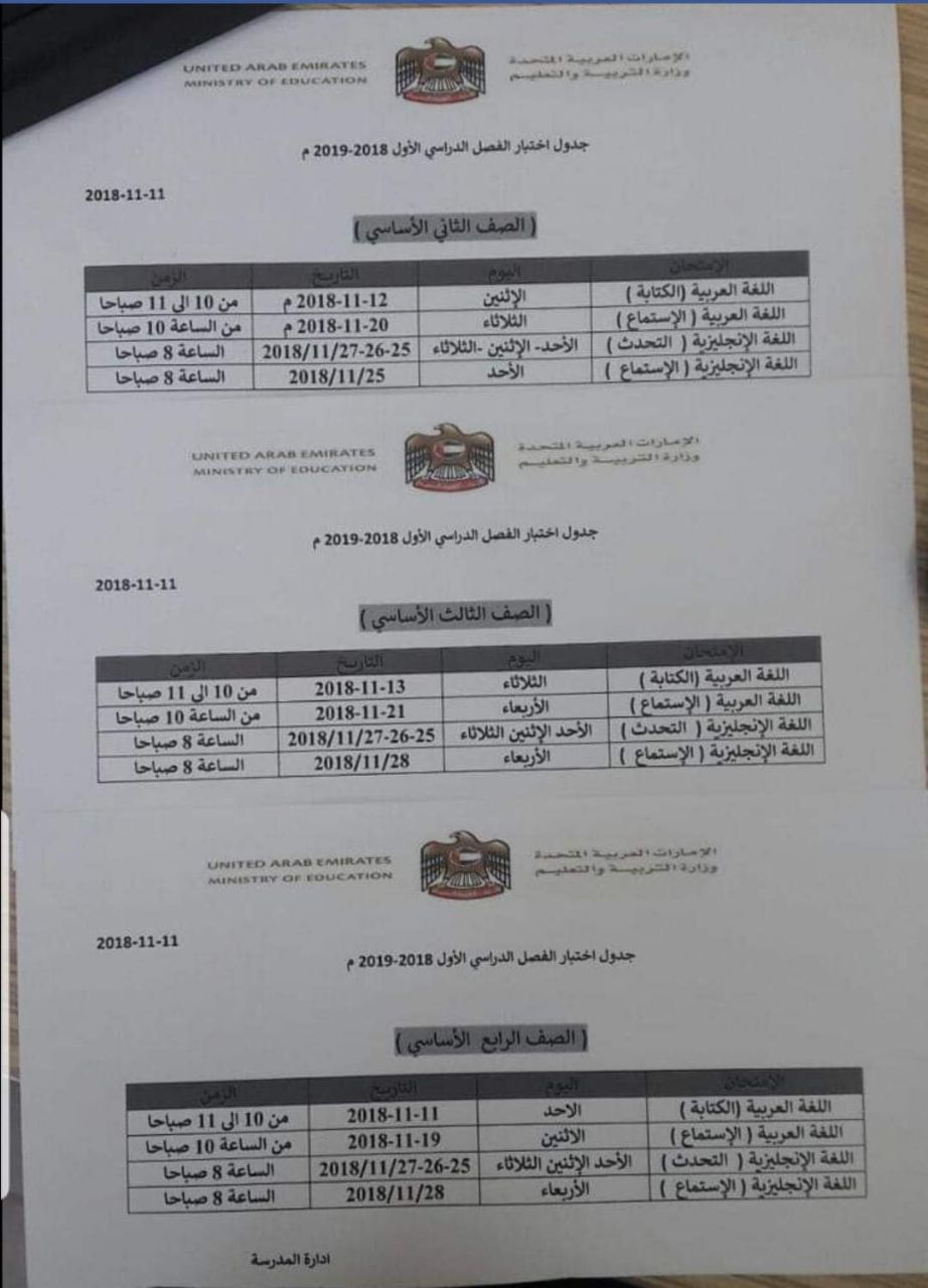 المواعيد الرسمية لاختبارات اللغة العربية والإنجليزية، الفصل الاول 2018-2019 للصفوف الثاني والثالث والرابع