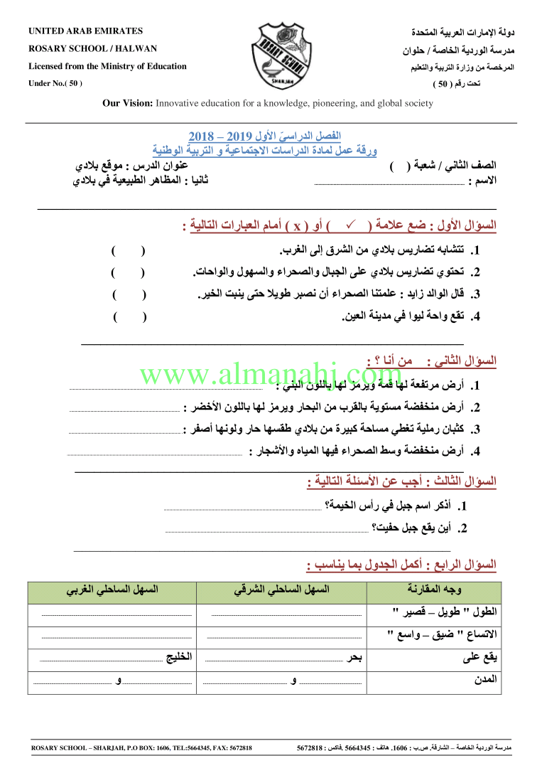 معلومات الملف: الصف الثاني, الفصل الأول, اجتماعيات, 2018-2019, ورقة عمل المظاهر الطبيعية في بلادي | |||