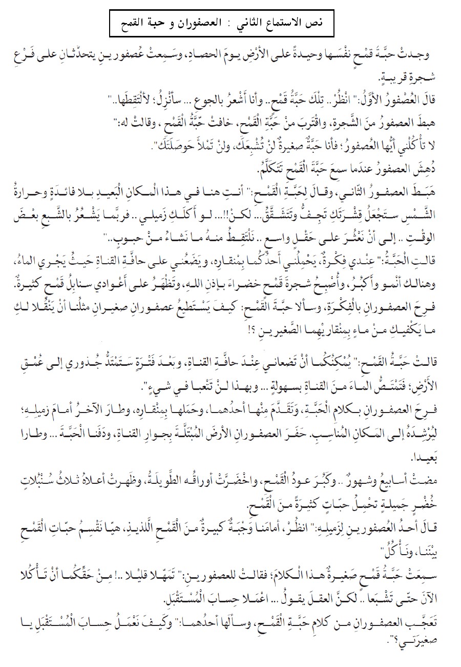 | اضغط هنا لتحميل وعرض ( نص الاستماع الثاني ( العصفوران وحبة القمح ) ) | |||