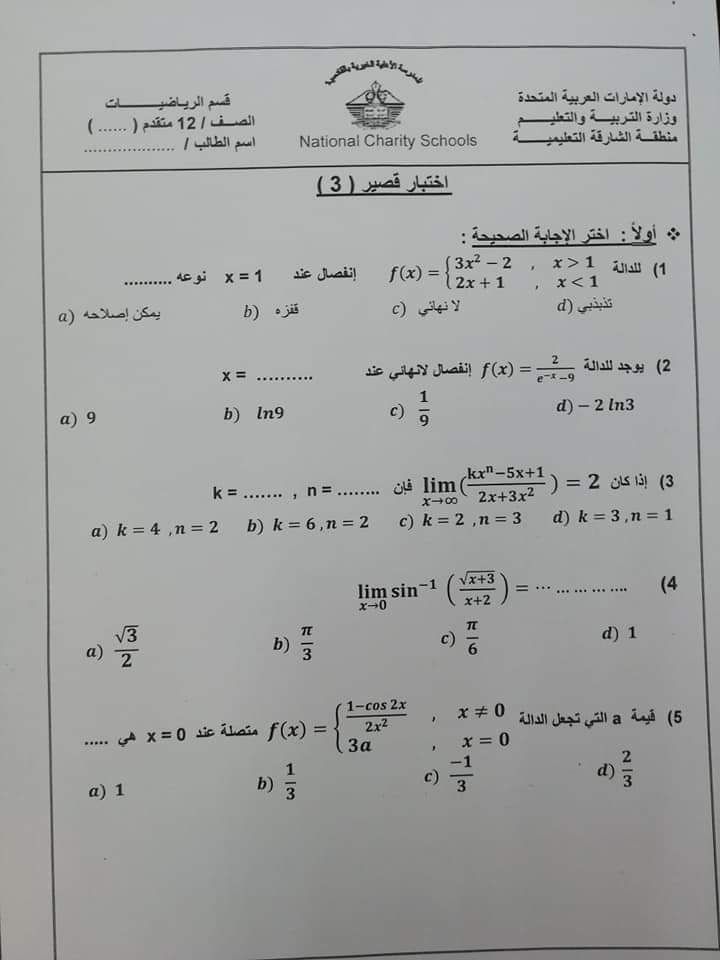 معلومات الملف: الصف الثاني عشر المتقدم, الفصل الأول, رياضيات, 2018-2019, اختبار قصير ((3)) | ||