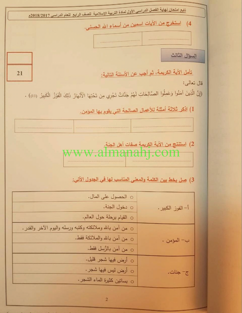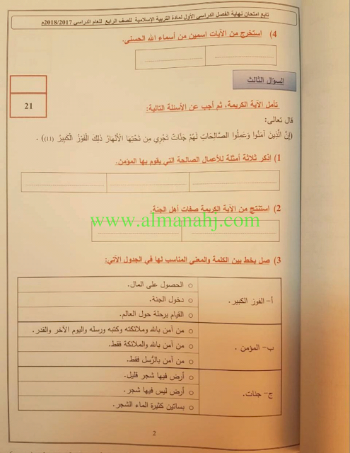 معلومات الملف: الصف الرابع, الفصل الأول, تربية اسلامية, 2018-2019, امتحان نهاية الفصل الاول 2017-2018 | |||