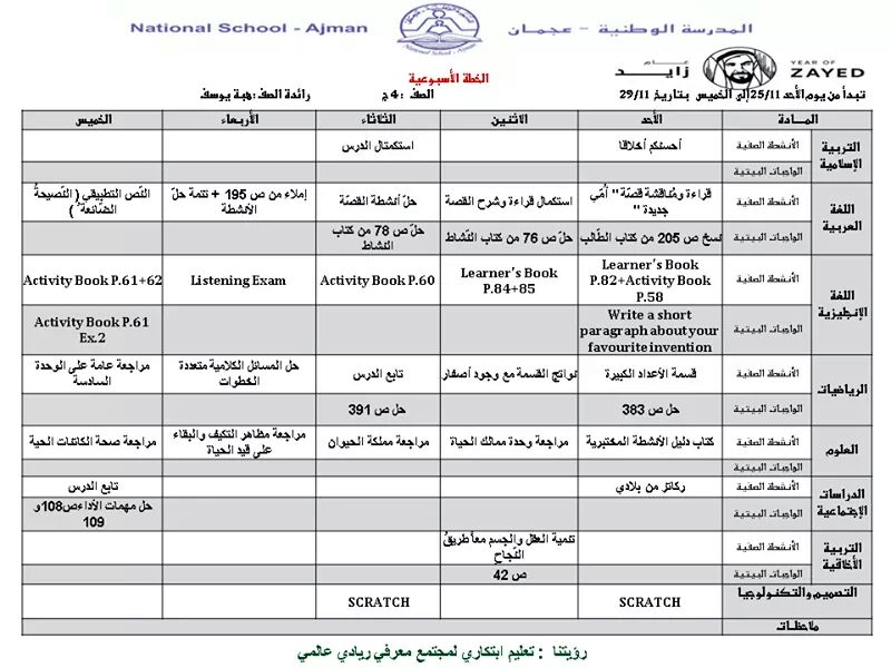 الخطة الاسبوعية للصف الرابع/ قسم الطالبات من الاحد 25/11 الى الخميس 29/11 المدرسة الوطنية عجمان | ||