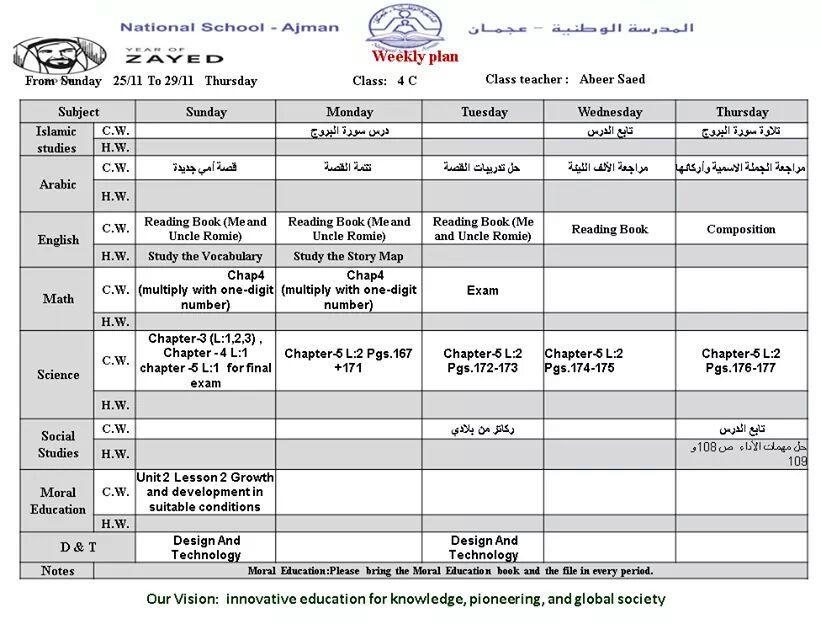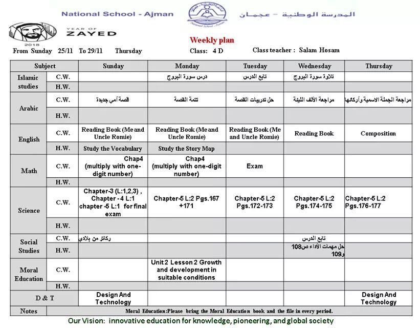 تفاصيل الخبر: الخطة الاسبوعية للصف الرابع/ قسم الطالبات من الاحد 25/11 الى الخميس 29/11 المدرسة الوطنية عجمان | ||