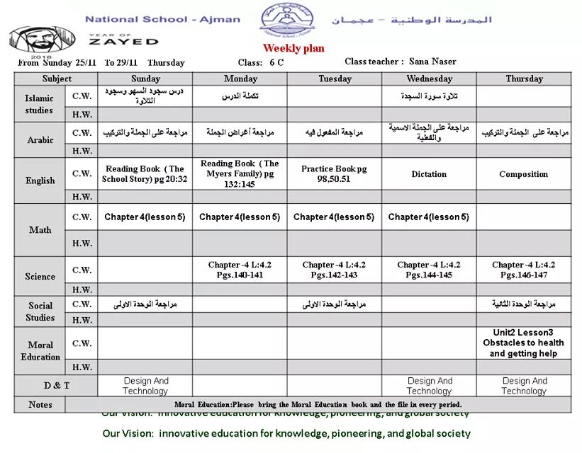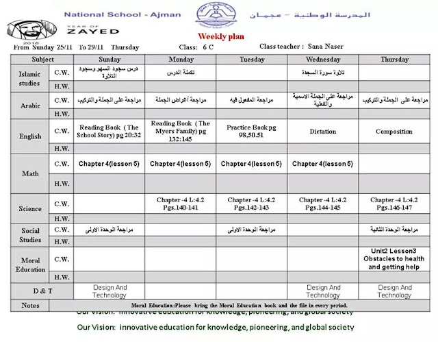 | الخطة الاسبوعية للصف السادس/ قسم الطالبات من الاحد 25/11 الى الخميس 29/11 المدرسة الوطنية عجمان | ||