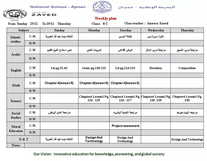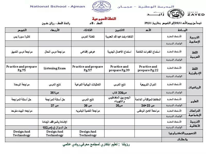تفاصيل الخبر: الخطة الاسبوعية للصف الثامن/ قسم الطالبات من الاحد 25/11 الى الخميس 29/11 المدرسة الوطنية عجمان | ||