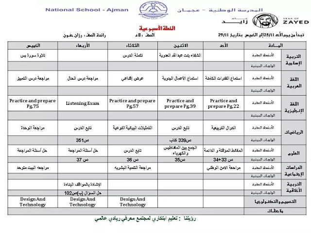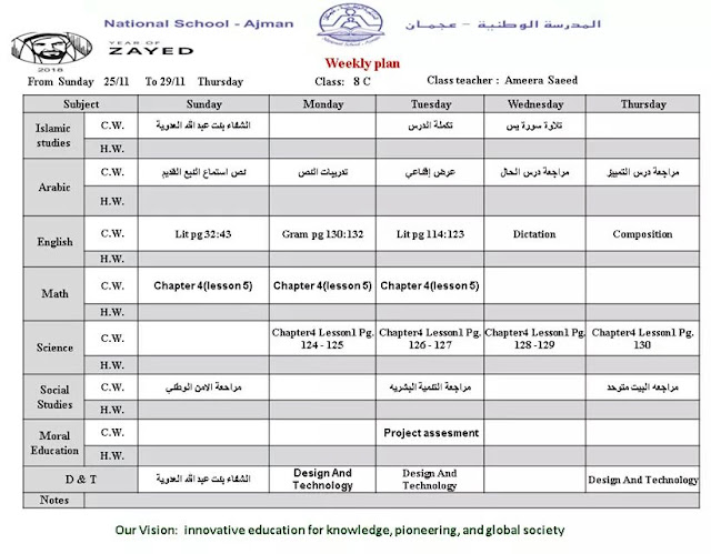 الخطة الاسبوعية للصف الثامن/ قسم الطالبات من الاحد 25/11 الى الخميس 29/11 المدرسة الوطنية عجمان | ||