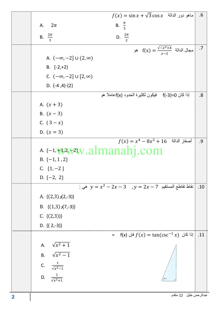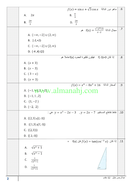 معلومات الملف: الصف الثاني عشر المتقدم, الفصل الأول, رياضيات, 2018-2019, متعدد اختبار منتصف الوحدة التمهيدية1 | |||