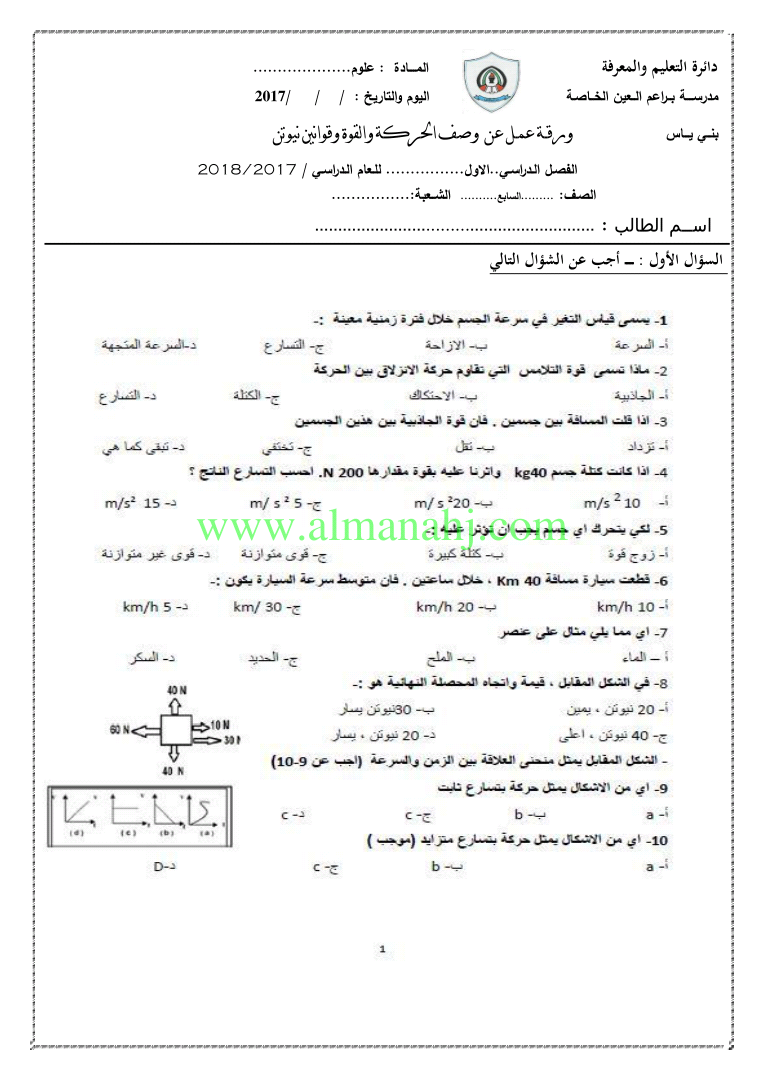 معلومات الملف: الصف السابع, الفصل الأول, علوم, 2018-2019, اوراق عمل الوحدة 2 الحركة والقوى ونيوتن | |||