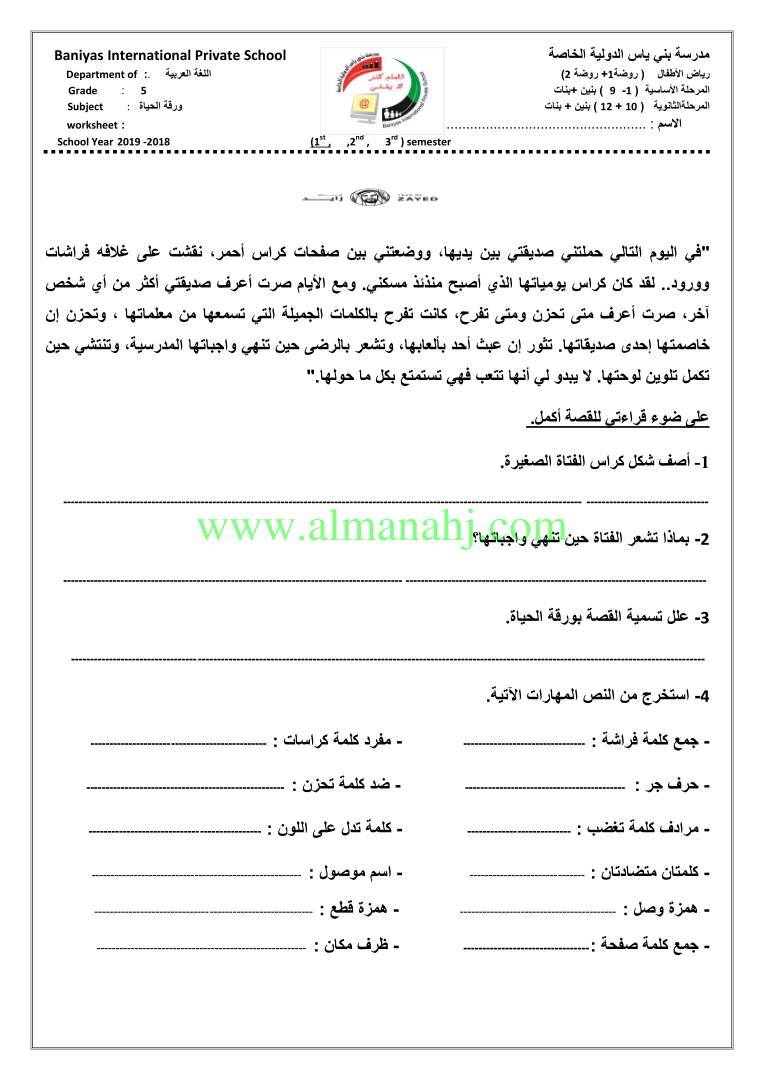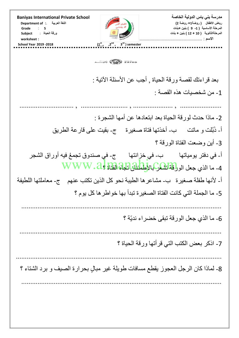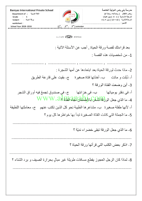 معلومات الملف: الصف الخامس, الفصل الأول, لغة عربية, 2018-2019, ورقة عمل ثانية لدرس ورقة حياة | |||