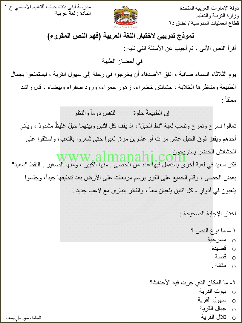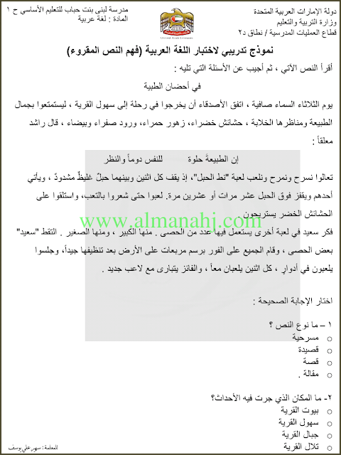 معلومات الملف: الصف الخامس, الفصل الأول, لغة عربية, 2018-2019, تدريب لاختبار اللغة العربية | |||