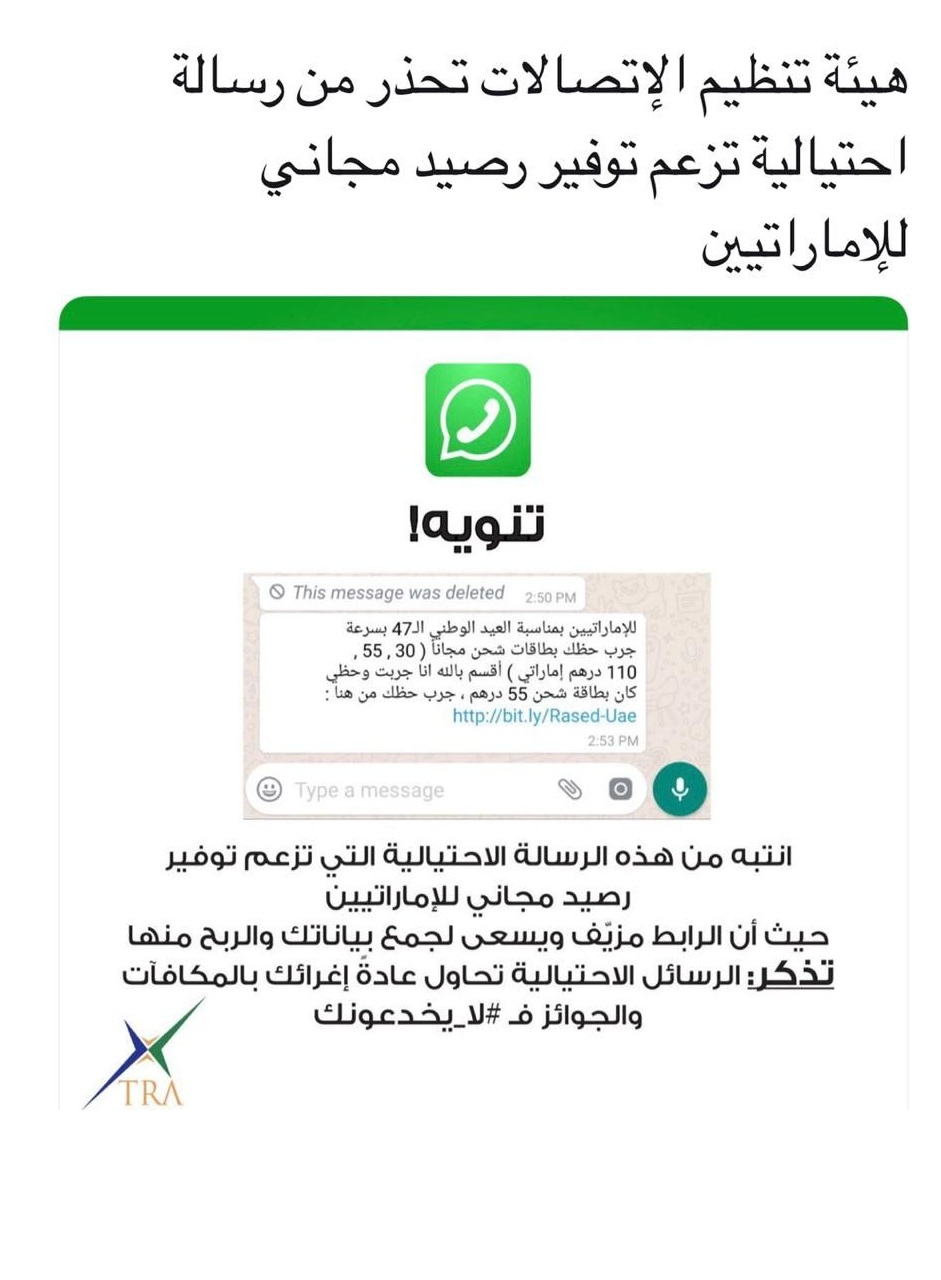 | هيئة تنظيم الاتصالات في الامارات تحذر من رسالة تزعم توفير رصيد مجاني بمناسبة العيد الوطني | ||