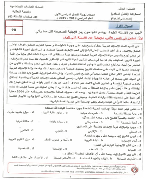 6. الصف الأول, اجتماعيات, أسئلة اختبار التقويم الثاني