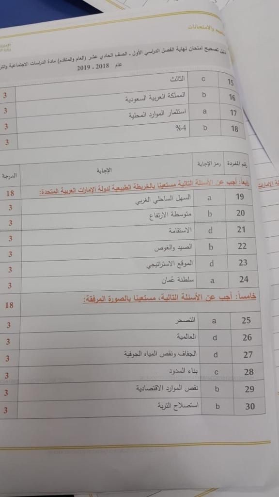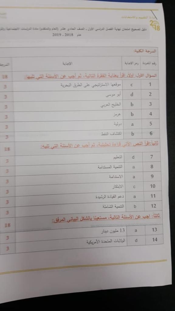 الصف الحادي عشر, الفصل الأول, اجتماعيات, 2018-2019, دليل تصحيح امتحان نهاية الفصل الاول2018-2019