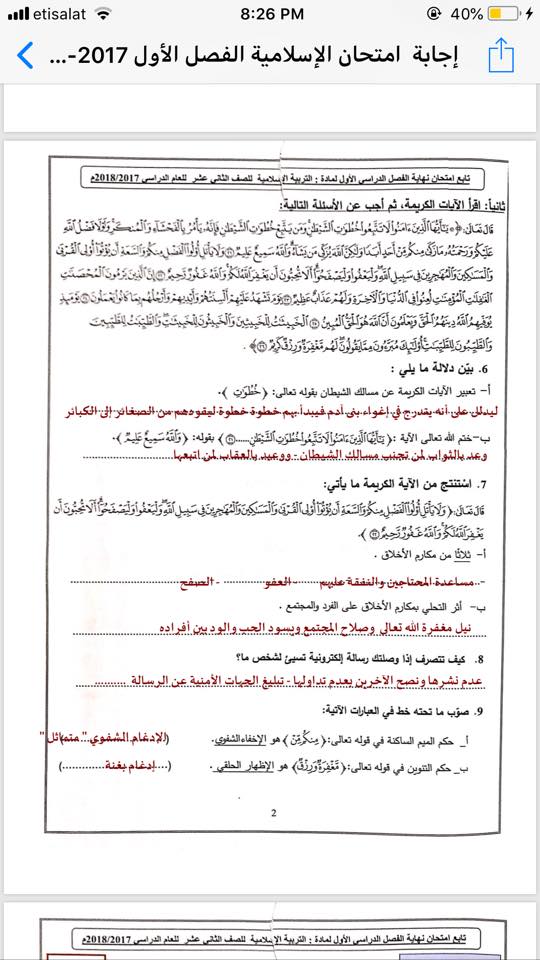 معلومات الملف: الصف الثاني عشر, الفصل الأول, تربية اسلامية, 2018-2019, حل أسئلة امتحان نهاية الفصل الاول من العام 2017_2018 | |||
