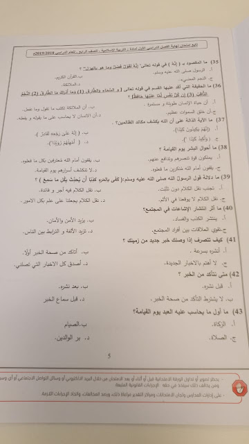 الصف الرابع, الفصل الأول, تربية اسلامية, 2018-2019, امتحان نهاية الفصل الاول 2018-2019