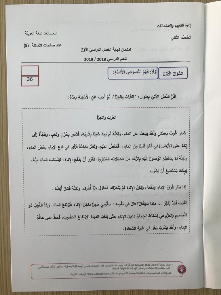 معلومات الملف: الصف الثاني, الفصل الأول, لغة عربية, 2018-2019, امتحان نهاية الفصل الأول 2018-2019 | ||