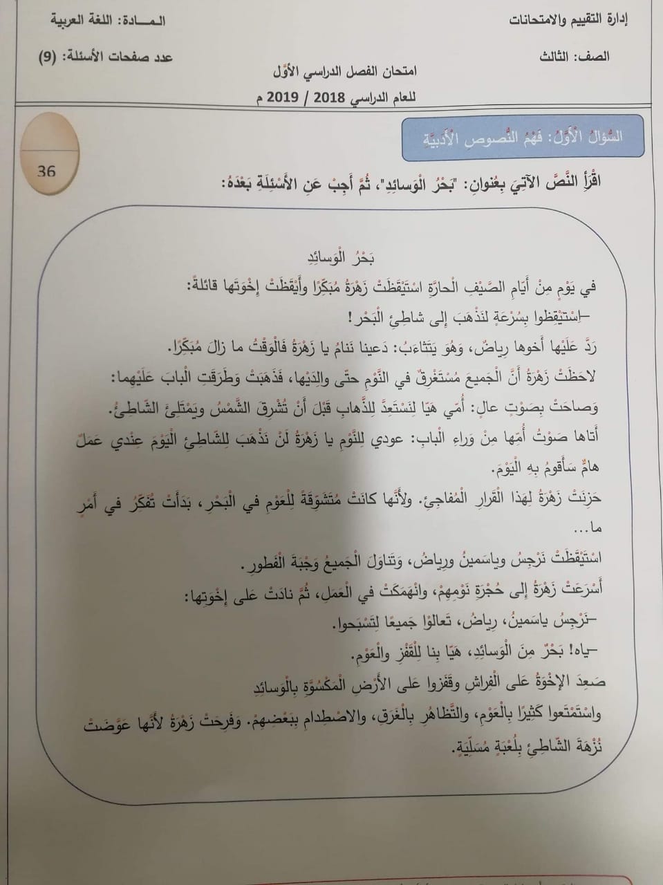معلومات الملف: الصف الثالث, الفصل الأول, لغة عربية, 2018-2019, امتحان نهاية الفصل الاول 2018-2019 | ||