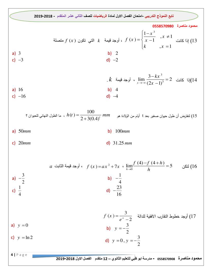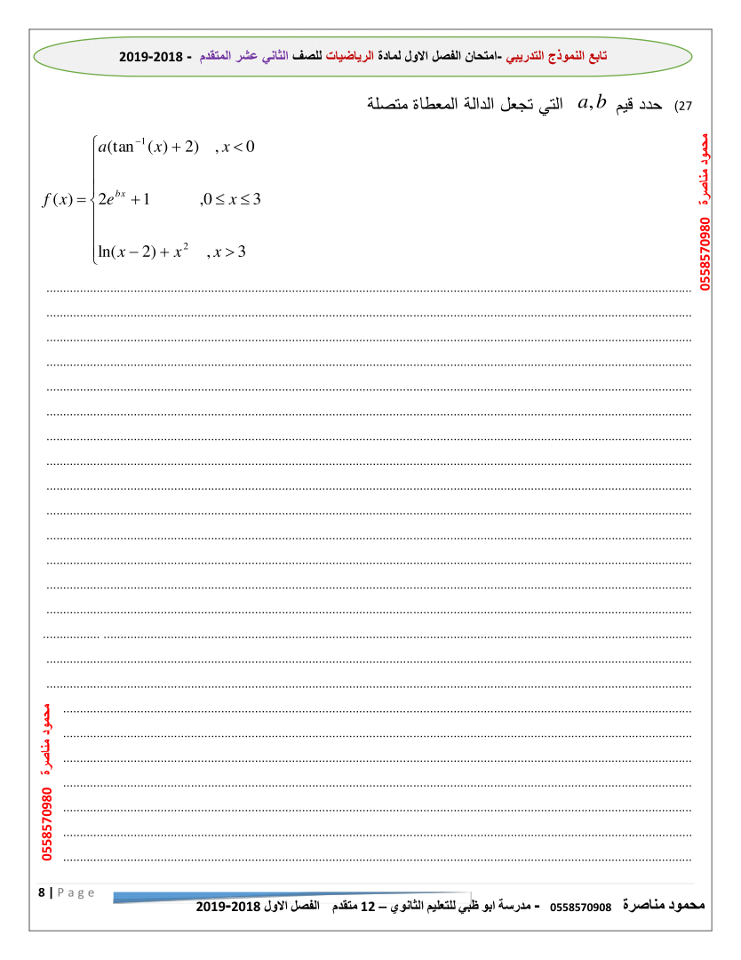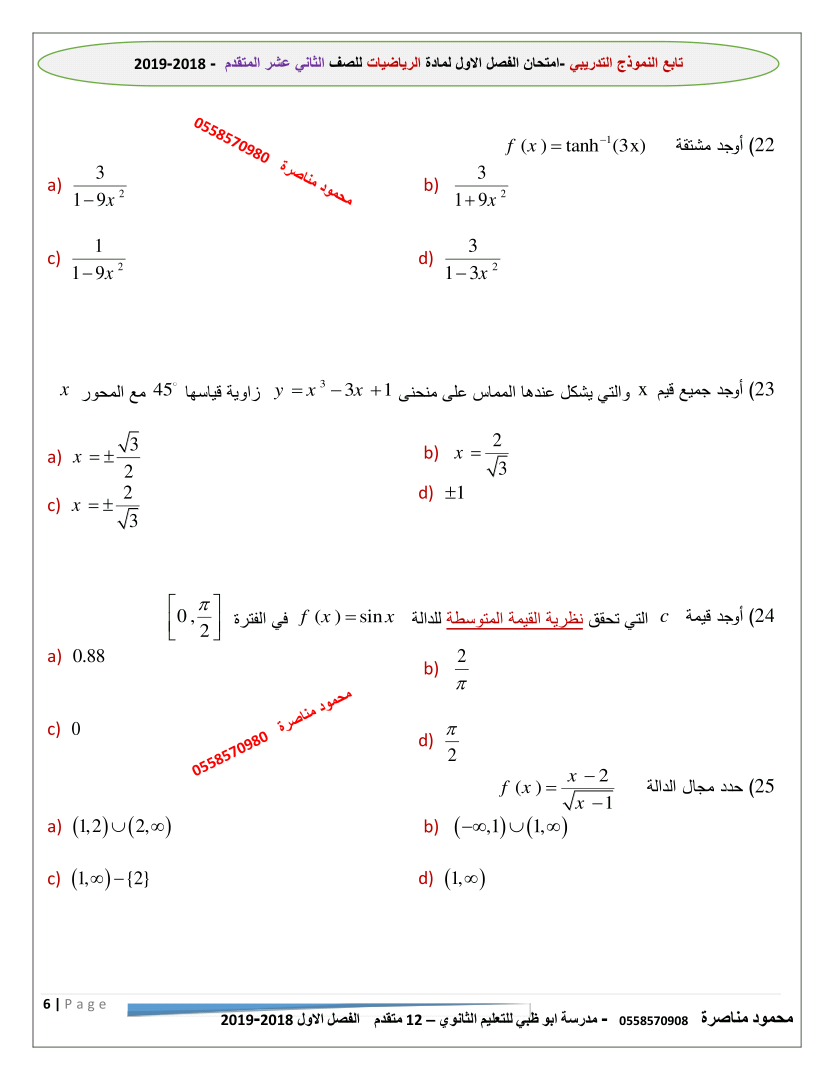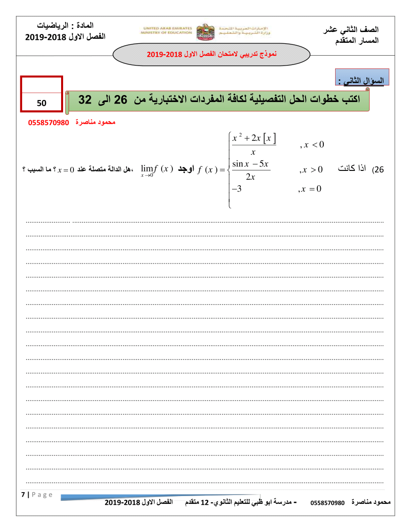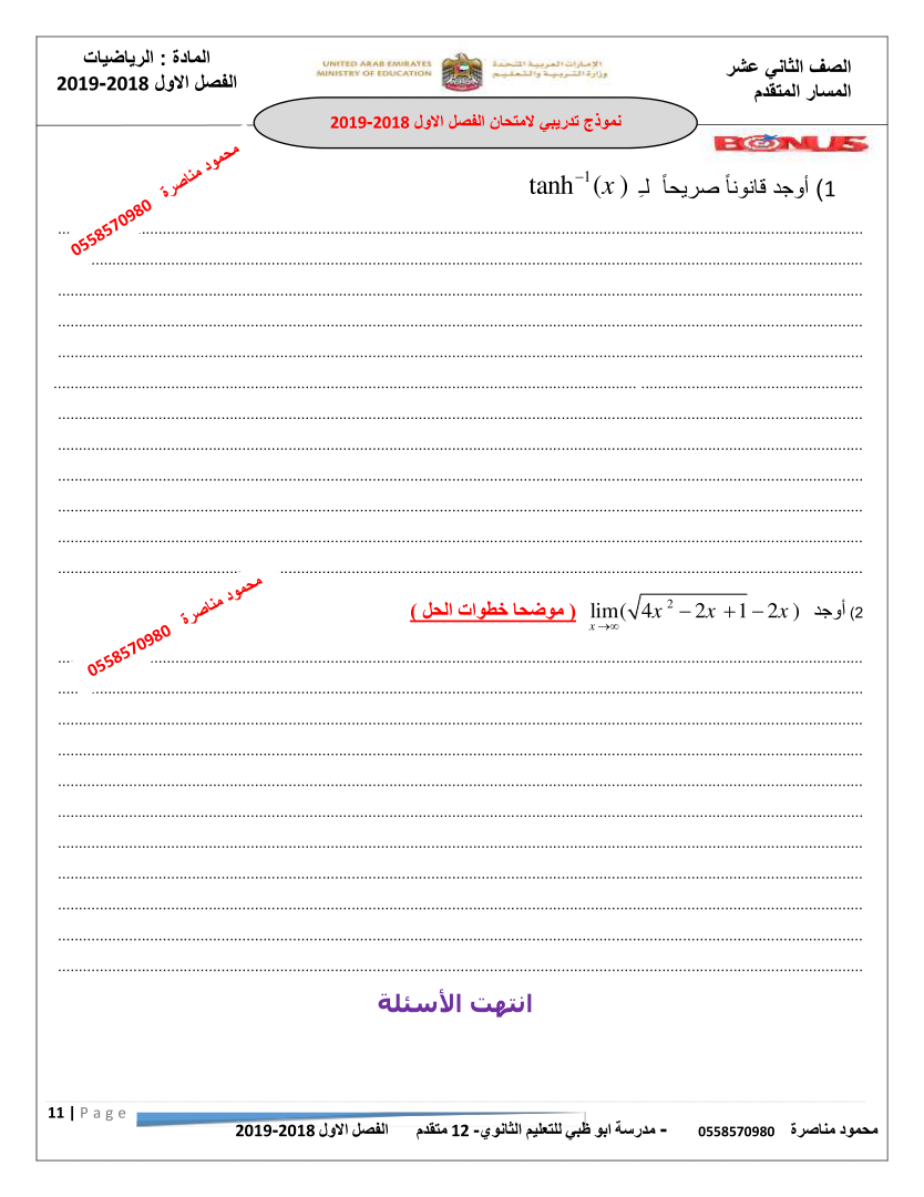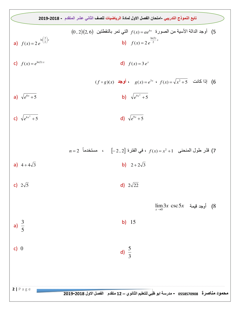 معلومات الملف: الصف الثاني عشر المتقدم, الفصل الأول, رياضيات, 2018-2019,نموذجتدريبي لامتحان الفصل الاول 2018-2019 | |||
