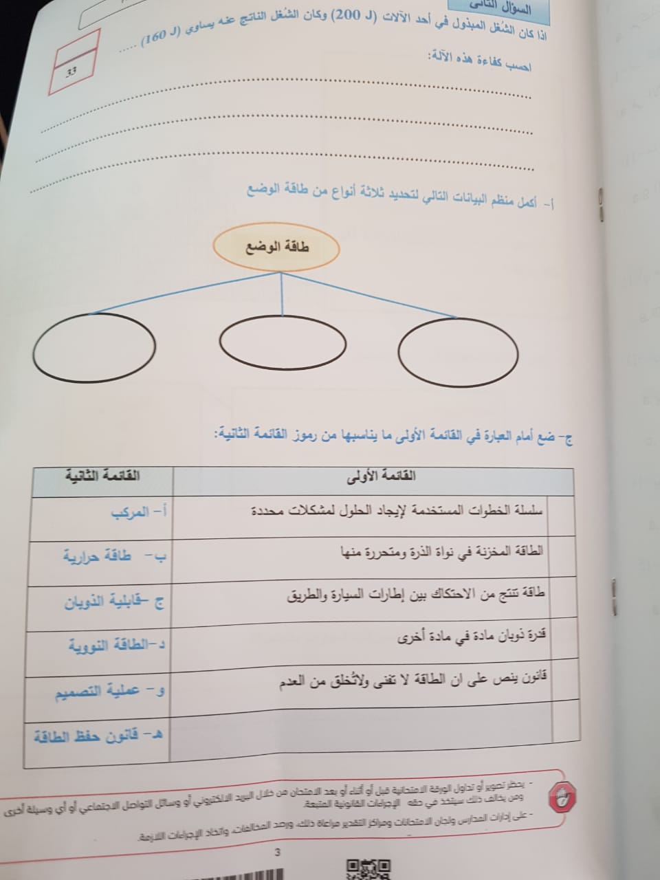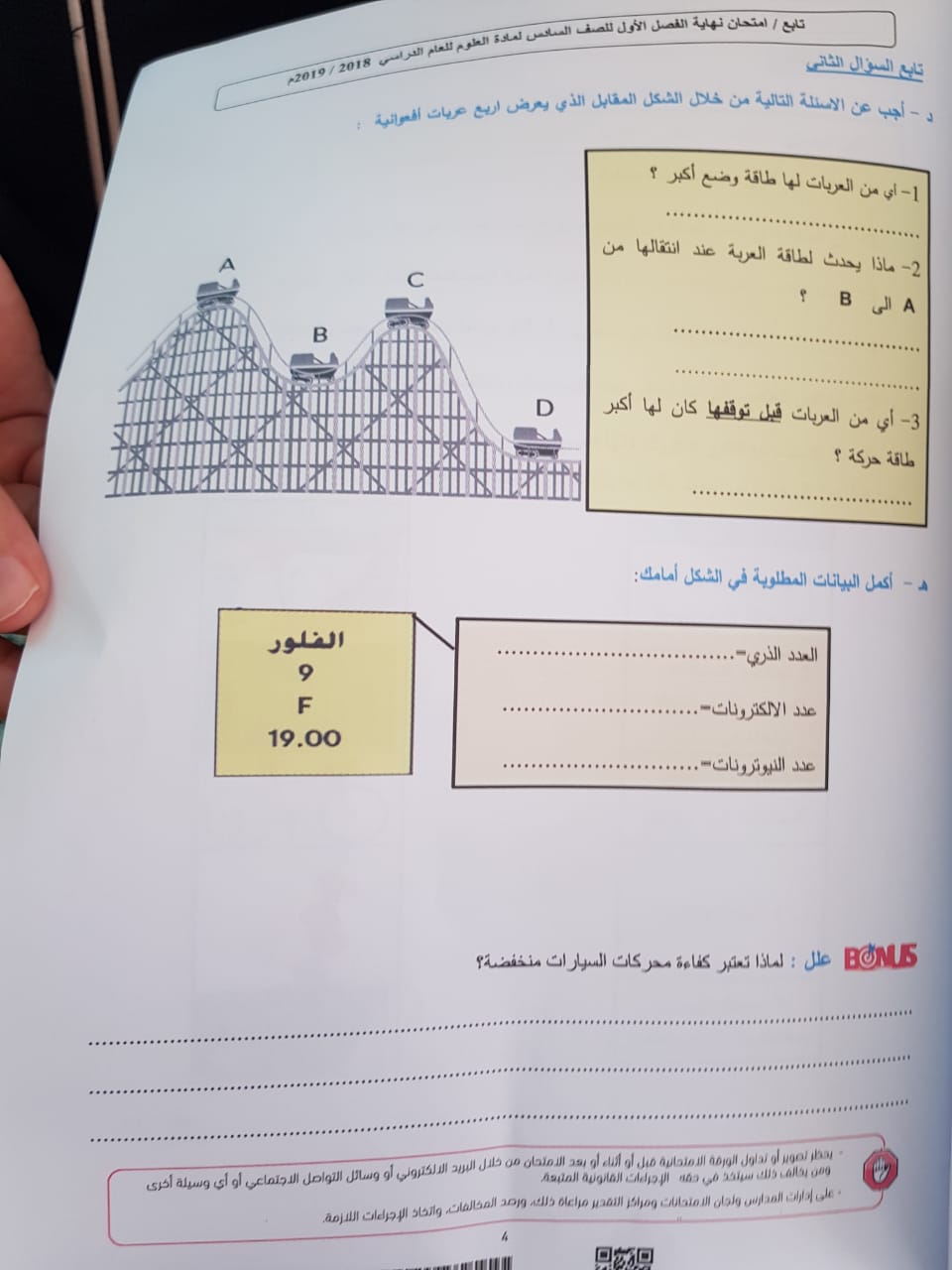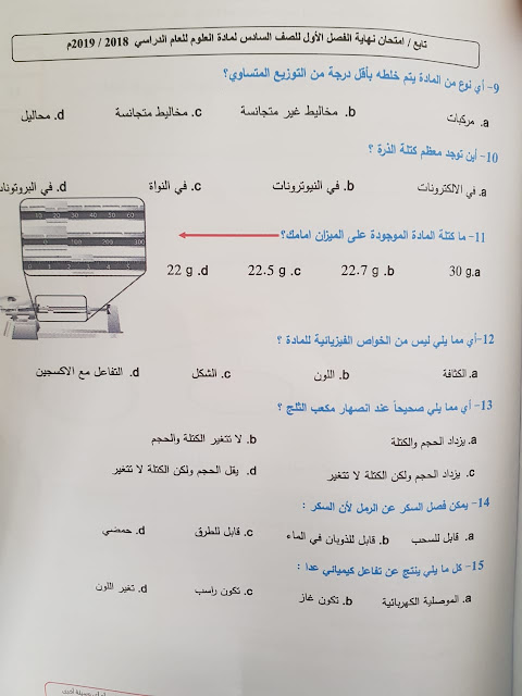 الصف السادس, الفصل الأول, علوم, 2018-2019, امتحان نهاية الفصل الاول 2018-2019