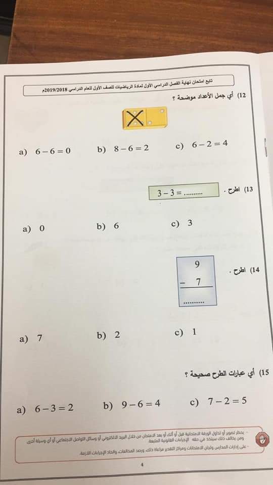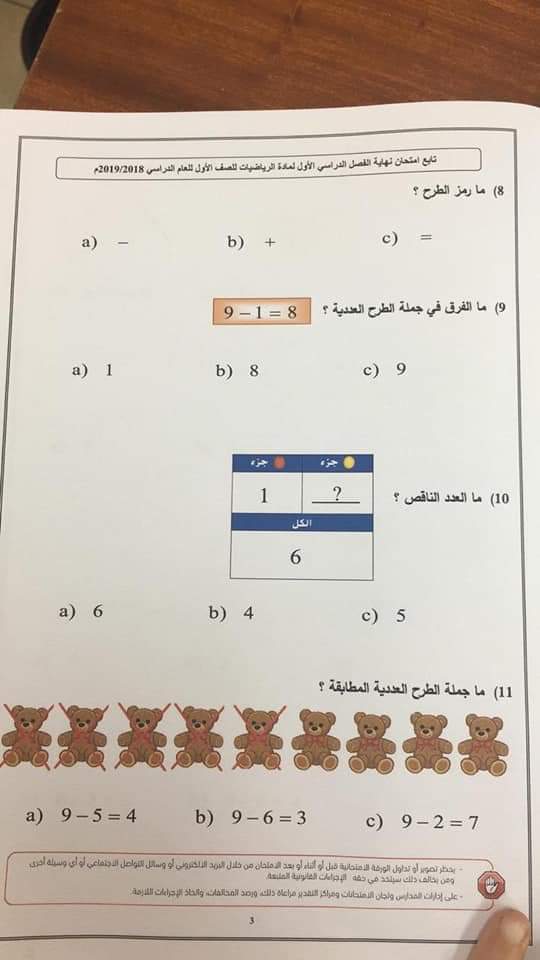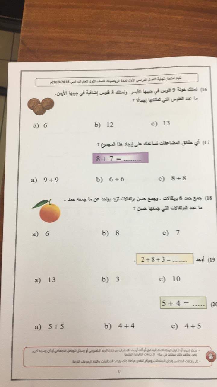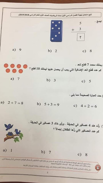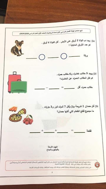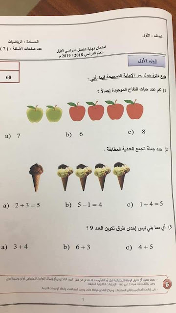 الصف الأول, الفصل الأول, رياضيات, 2018-2019, امتحان نهاية الفصل الاول 2018-2019