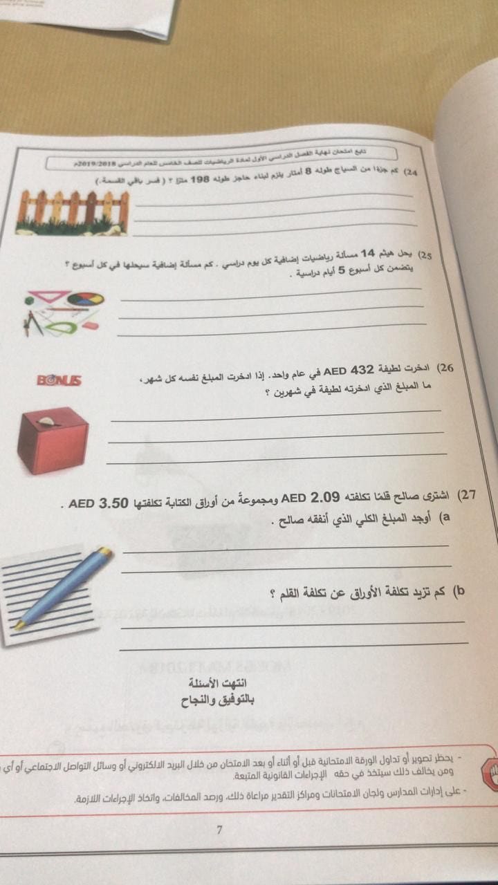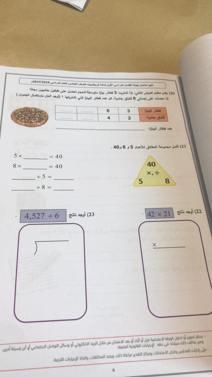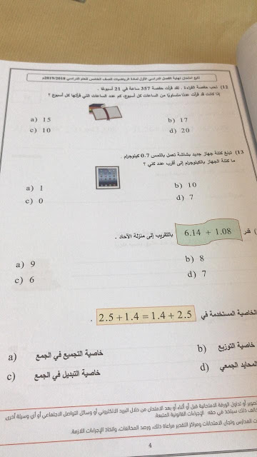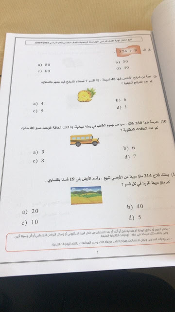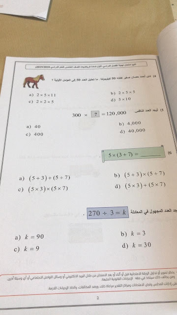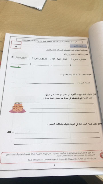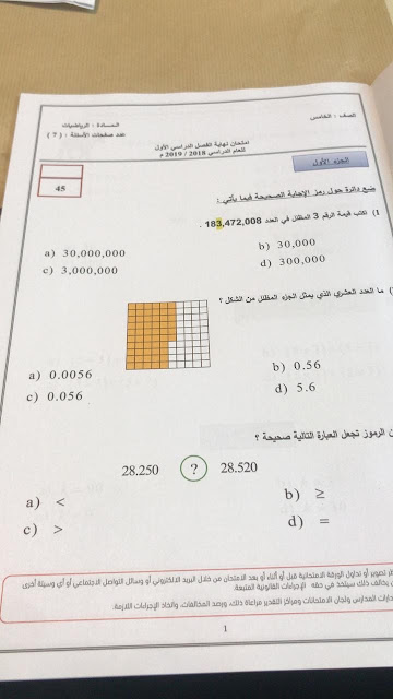 الصف الخامس, الفصل الأول, رياضيات, 2018-2019, امتحان نهاية الفصل الاول 2018-2019